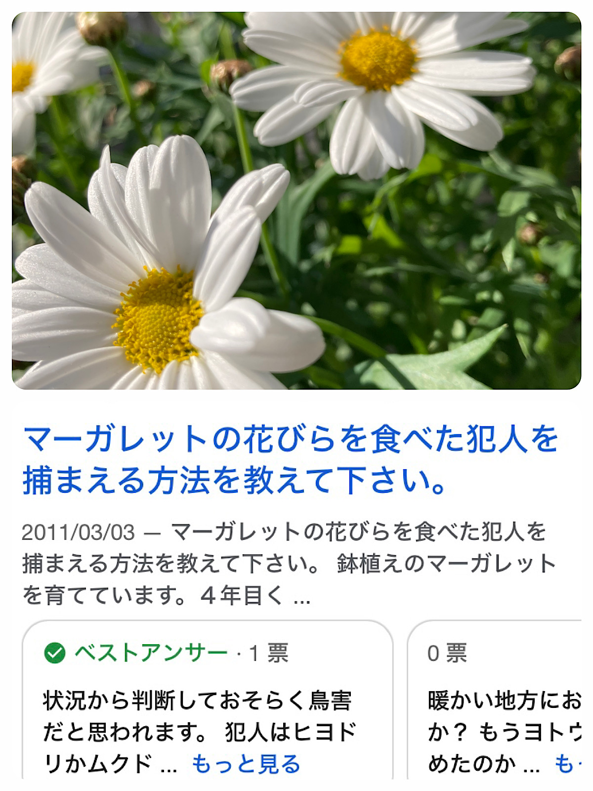 mau @admin まうです。コーヒーが好きです。 2024年1月31日(水) 09:21 日々雑感 昨日、鉢植えのマーガレットを買… 昨日、鉢植えのマーガレットを買ったのでぼんやり見てたら、なんだか葉っぱが美味しそうに見えてついつい検索したのね。そしたら、検索結果で出てきたページがなんか絵本の中の大問題!みたいな気分の出だしで、ちょっと愉快✨ いつかヒヨドリに生まれ変わったらマーガレットの花、食べにどこかの花好きさん家に立ち寄ろう〜🕊️ あ、葉っぱには毒がある、とのことらしいので食べちゃダメだそうです🙅