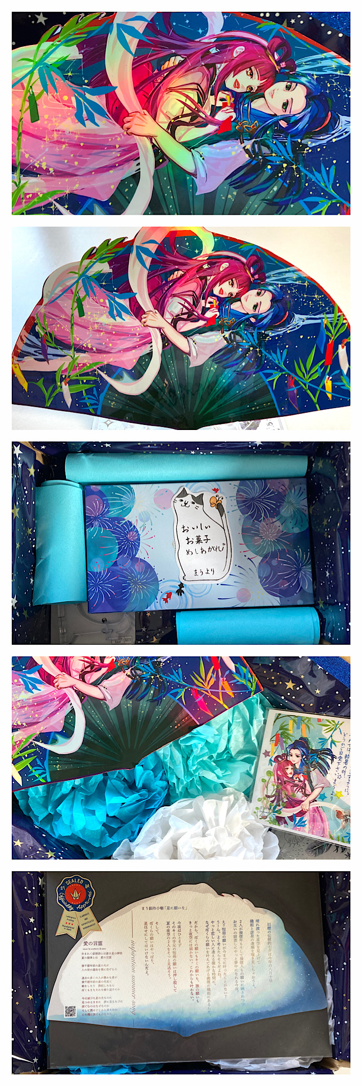mau @admin まうです。コーヒーが好きです。 2024年8月10日(土) 18:44 自創作 夏の暑中見舞いとして贈った制作… 夏の暑中見舞いとして贈った制作品2✨ 扇型🪭で銀河で戯れる織姫と彦星を描きました✨キラキラホログラムです。緩衝材に紙の花をあしらったよ⸝⋆ダンボールの蓋開けたらそこはもう銀河!って感じにできたよ😚 自創作verね。