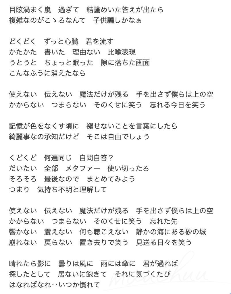 歌詞「使えない 伝えない 魔法だけが残る 手を出さず僕らは上の空」 双子の願い、お互いの約束事が呪いとなって…。泣けます。